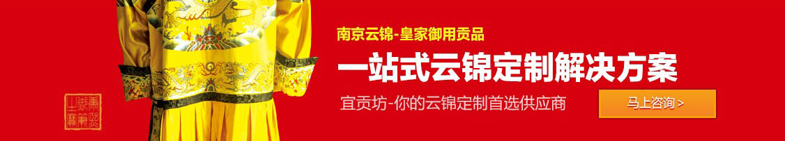 南京宜貢坊云錦文化科技有限公司成立于二OO一年,場(chǎng)地面積10000㎡,致力于做中國(guó)知名的云錦,宜貢坊云錦文化科技有限公司座落于江寧開(kāi)發(fā)區(qū)。做為江蘇云錦文化科技品牌之一,南京宜貢坊擁有雄厚的技術(shù)力量和實(shí)力,現(xiàn)有大型傳統(tǒng)花木樓織機(jī)幾十臺(tái),織造師、研究設(shè)計(jì)人員數(shù)百人。公司擁有直屬北京、深圳、上海辦事處和近千家緊密經(jīng)銷商、合作商;產(chǎn)品在南京中央商場(chǎng)、新百、上海八百伴、上海友誼商場(chǎng),泰州金鷹等全國(guó)多家大型商場(chǎng)均有專柜。